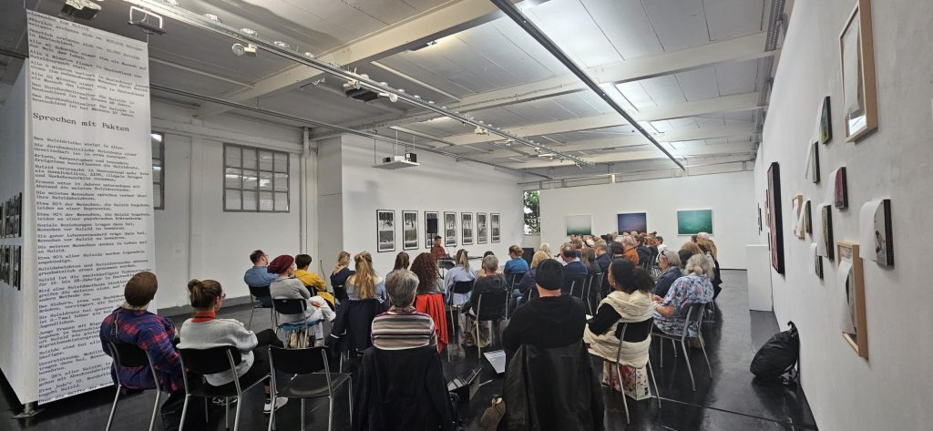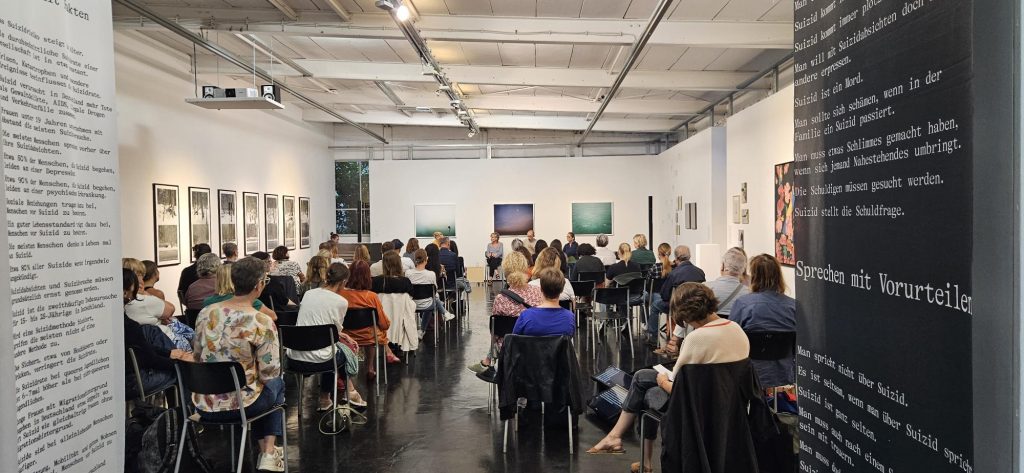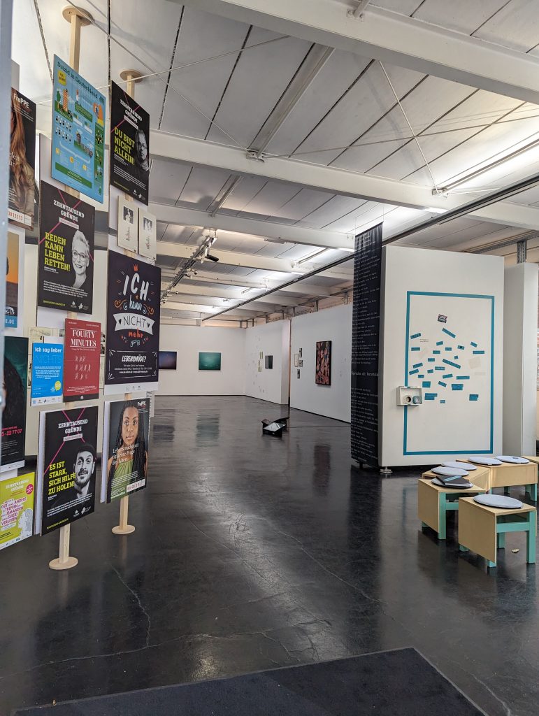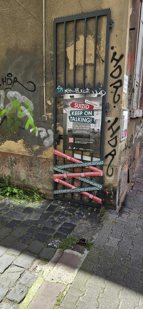 Zum diesjährigen Welttag der Suizidprävention haben wir vom 9. September bis 8. Oktober die Ausstellung Suizid – let´s talk about it! in verkleinerter Form und unter dem abgeänderten Titel Suizid – keep on talking! nach Frankfurt holen können. Es war eine lange Reise, die im Winter 2022 begann und uns das gesamte Jahr 2023 auf Trab hielt. Vom Finden einer geeigneten Ausstellungsfläche und der Finanzierung über die Organisation des Rahmenprogramms und der Bewerbung bis hin zur Begleitung der Kuration und des Aufbaus – wir haben mitunter echt geschwitzt, ob alles funktioniert. Aber das hat es und die vier Wochen waren ein voller Erfolg! Nicht zuletzt dank der wunderbaren Kooperation mit dem Kasseler Museums für Sepulkralkultur und mit Unterstützung einiger wichtiger Akteure, zum Beispiel dem Kulturamt oder dem Galeristen der AusstellungsHalle 1A Dr. Robert  Bock.