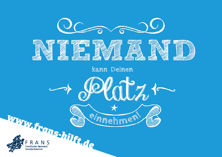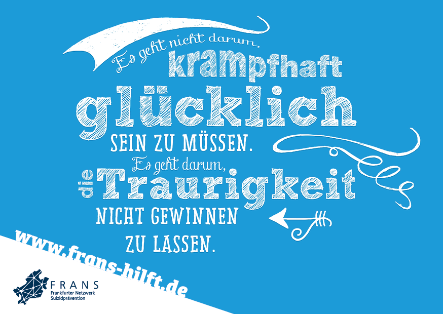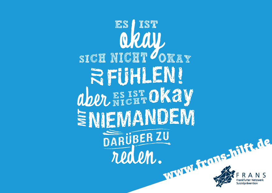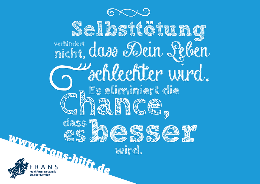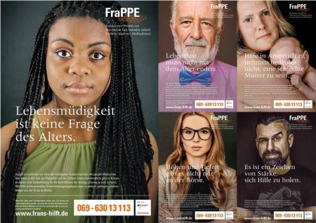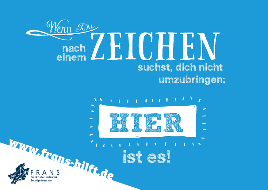Im Rahmen des Forschungsprojekts FraPPE (Frankfurter Projekt zur Prävention von Suiziden mittels Evidenz-basierter Maßnahmen) der Uniklinik Frankfurt und des Gesundheitsamts wurde eine Plakatkampagne entwickelt, die aufklären, zur Entsigmatisierung des Themas beitragen und auf eine neu eingerichtete Hotline hinweisen soll. Unter der Nummer erreichen Sie in akuten Notfällen mit Suizidalität rund um die Uhr eine Ärztin oder einen Arzt der Klinik für Psychiatrie des Universitätsklinikums Frankfurt am Main.