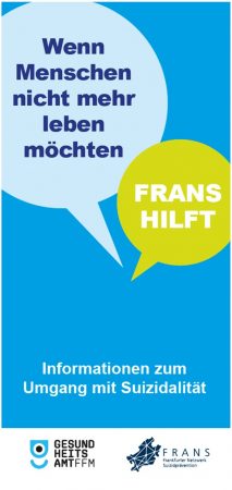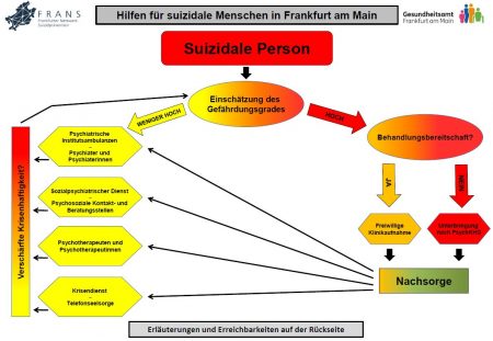 Im FRANS-Arbeitskreis Krisenversorgung wurde ein Ablaufschema zu Suizidalität entwickelt. Es zeigt erprobte Wege der Hilfen für Menschen in suizidalen Krisen in Frankfurt am Main auf und soll eine Hilfestellung für FRANS-Mitgliedsorganisationen sowie alle Menschen bieten, die in Kontakt mit suizidalen Personen kommen.
