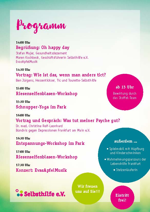 Hintergrund: Der Markt der Frankfurter Selbsthilfegruppen zieht in diesem Jahr vom Römer zum Stoffel. Dort können Sie sich wie gewohnt zum Thema Selbsthilfe bei Sucht, psychischen Erkrankungen, für Angehörige, in besonderen Lebenslagen sowie bei chronischen Erkrankungen informieren. Außerdem erwartet Sie ein buntes Programm für Jung und Alt: Mitmachaktionen, Spielmobil, Musik und Kultur.