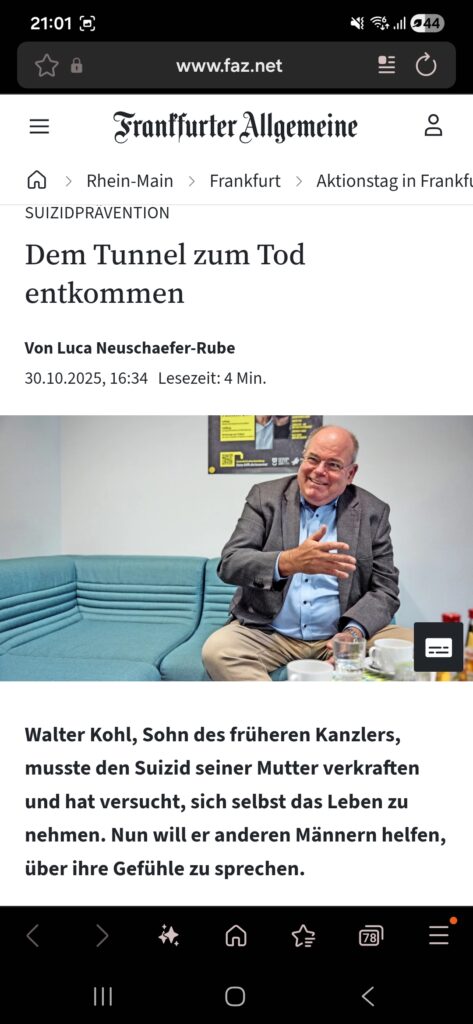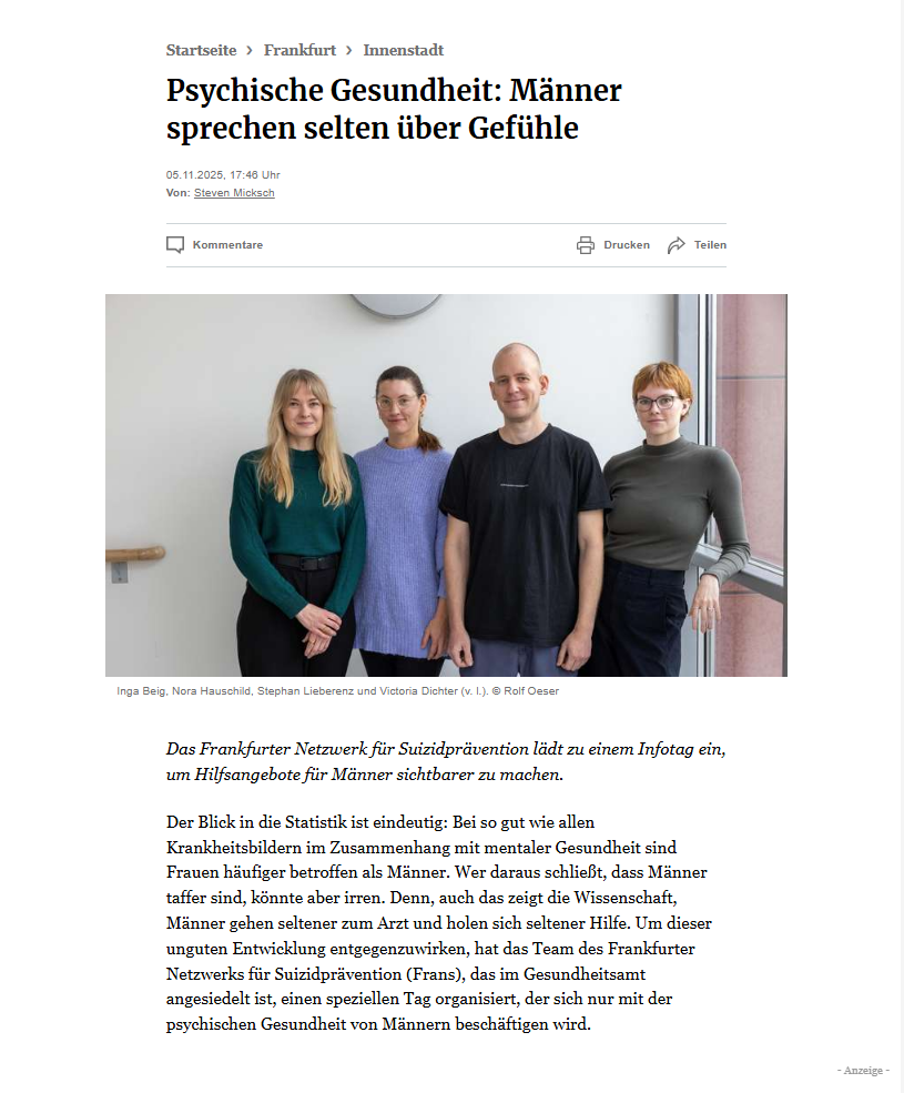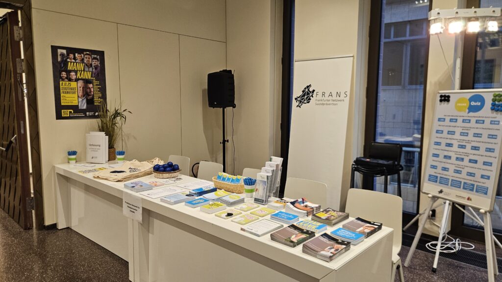 Am 8. November 2025 fand der vom Frankfurter Netzwerk für Suizidprävention organisierte Infotag „MANN KANN“ zum Thema Männer und psychische Gesundheit statt. Nach monatelanger Vorbereitung, reger Beteiligung des Netzwerkes und Arbeitskreises Awareness- und Antistigma-Arbeit öffnete das Stadthaus am Veranstaltungstag seine Türen für rund 337 Personen. Besonders erfreulich waren die ca. männlichen 250 Besucher und damit das Fazit, dass eine geschlechtssensible und zielgruppenadäquate Ansprache auch im Bereich psychischer Gesundheit zu einer guten Inanspruchnahme durch Männer beitragen kann.