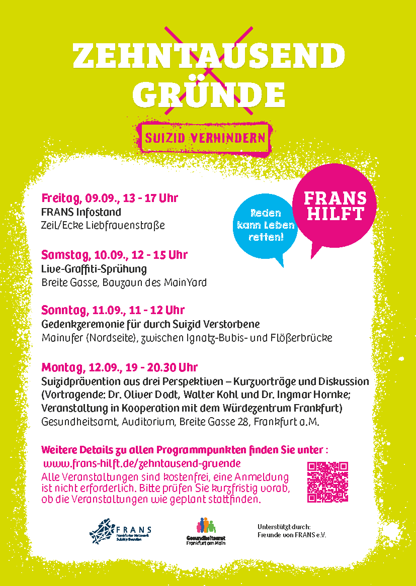 Auch in diesem Jahr organisiert das Frankfurter Netzwerk für Suizidprävention unter der Kampagne “Zehntausend Gründe – Suizid verhindern” wieder verschiedene Veranstaltungen rund um den Welttag der Suizidprävention. Weitere Informationen zu allen Terminen zwischen dem 09. und 12. September finden Sie unter unter diesem Link.